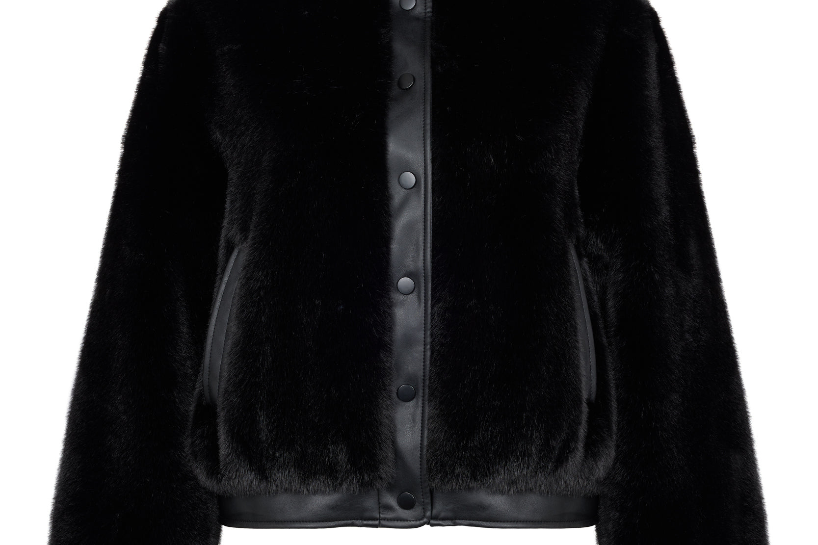 • Plush black faux fur jacket with a funnel neckline, long sleeves and a popper fastening through the front.