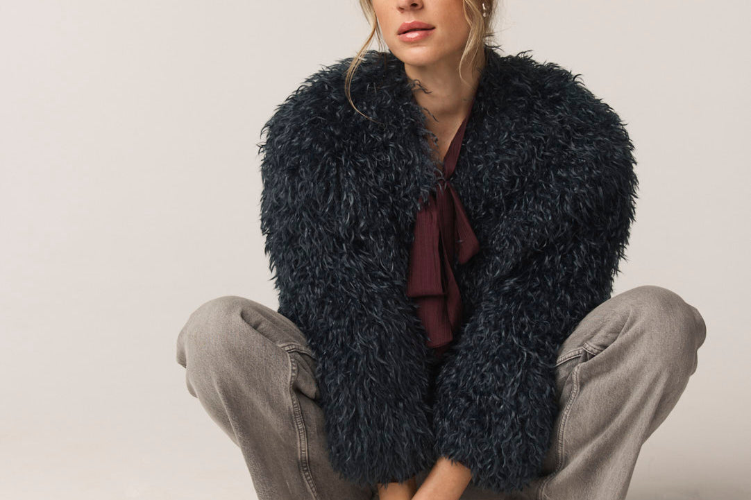 The cropped "Sadie' jacket from Issy London crafted using vegan Mongolian faux fur in a striking teal blue, redefines modern glamour with a conscious edge.